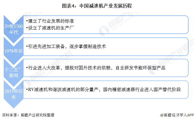 减速机在我国的发展已有近40年的历史,广泛应用于国民经济及国防工业的各个领域。产品已从最初单一的摆线减速机,发展到现在的多品类,即摆线减速机、无级变速器、齿轮减速机、蜗轮蜗杆减速机、电动滚筒等。减速机行业在中国主要经历了四个阶段,20世纪60年代 ,我国建立了行业发展的标准,设立了专门生产减速机的生产厂;1978年后国家引进先进加工装备,通过引进、吸收国外先进技术和科研攻关,逐步掌握各种高速和低速重载齿轮装置的设计制造技术;十二五”期间节能减排环保型减速机取代高能耗、高污染、低效率减速机。行业进入大改革,摆脱对囯外技术的依赖,自主研发节能环保型产品;2015年以来,《中国制造2025》要求突破突破机器人减速器等高端产品的技术,意味着减速机技术进入追赶期,随着国内RV减速机和谐波减速机的部分量产,国内精密减速器行业进入国产替代阶段。