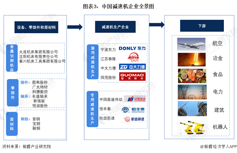 上游企业主要包括设备生产企业、零部件生产企业及原材料企业,减速机主要生产设备为金属切削机床,主要企业为大连机床集团等;零部件生产企业包括铸件和轴承生产企业;原材料生产企业主要为钢铁企业。中游参与者主要为通用减速机、专用减速机生产企业和机器人减速机生产企业。减速机下游应用领域较广,涉及冶金、航空、食品、机器人等。