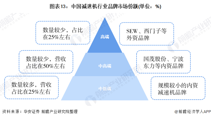 国内工业减速机市场逐渐呈现中低端两极分化趋势。随着下游制造业升级,多样化需求对减速机企业的综合实力提出了更高要求。2019年,德国SEW和西门子等高端品牌市场份额占比达到25%左右,国茂、宁波东力等国产中端品牌市场份额达50%,低端品牌占比约为25%。