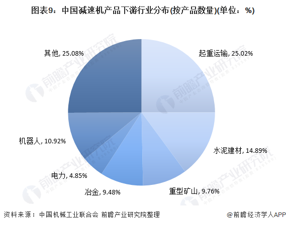 减速机的下游应用行业主要包括起重运输、水泥建材、重型矿山、冶金、电力和航空船用等国民经济及国防工业的各个领域。其中,起重运输行业使用减速机产品的数量占比约为25.02%,水泥建材行业使用减速机产品的数量占比约为14.89%,重型矿山行业占比约为9.76%。