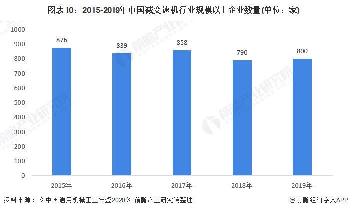 据《中国通用机械工业年鉴2020》公布的数据显示,2015-2019年我国减变速机行业规模以上企业数量波动变化。2019年,我国减变速机行业规模以上企业数量为800家。