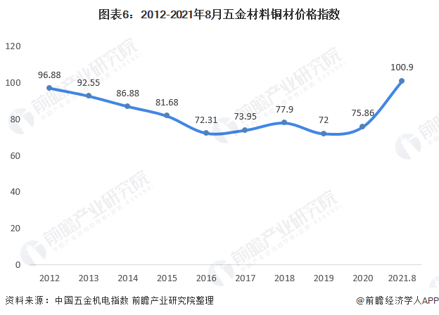 根据中国五金机电指数的铜材价格指数数据显示,2012-2021年国内铜材价格指数呈波动变化趋势。2012-2016年,铜材价格指数逐年下降,从2012年的96.88下降至2016年的71.32。2017年后,铜材市场价格趋势波动不大,2020年价格指数为75.86。2019-2021年我国铜材价格不断攀升,受原矿石价格上涨的影响,截至2021年8月底,2021年铜材价格指数为100.9,处于最近几年的高点。