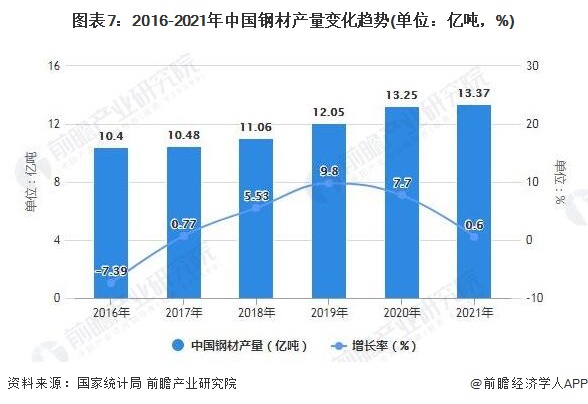 2016-2020年,我国钢材产量处于持续上升的趋势。2020年中国钢铁生产保持平稳增长。据国家统计局公布的数据,2020年,中国钢材产量13.25亿吨,同比增长7.7%。2021年1-12月,中国钢材产量为13.37亿吨,产量同比增长0.6%。